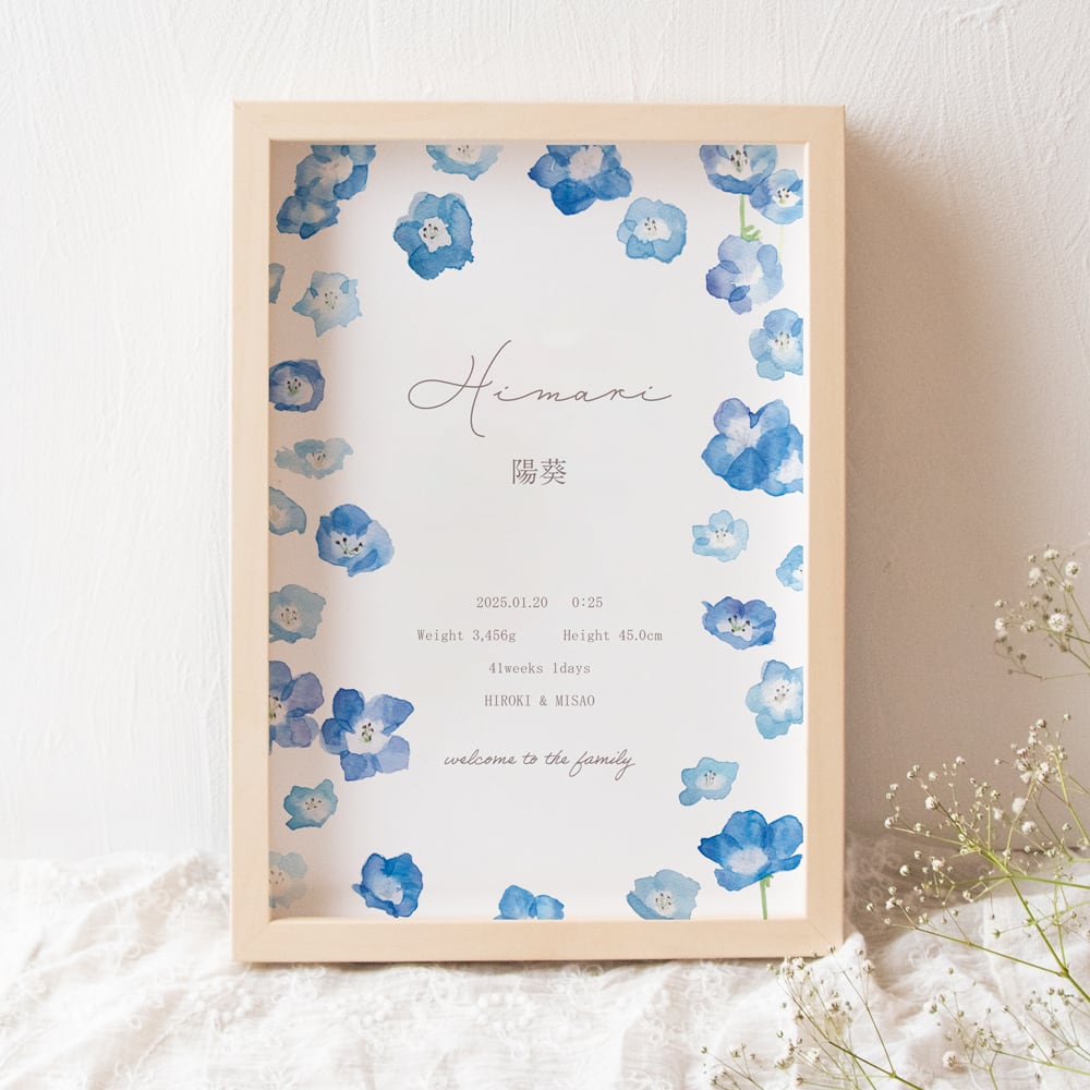 手描きの水彩イラストでネモフィラの優しい青を表現した命名書です。