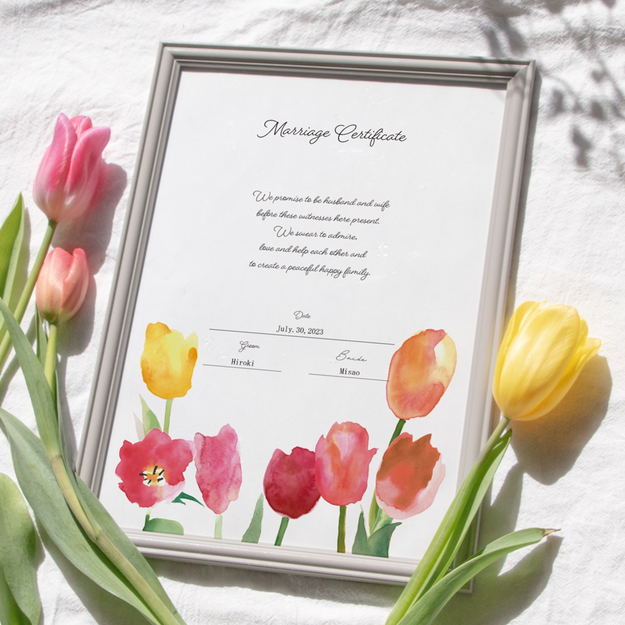 春の息吹を感じる、優しい色合いのチューリップを透明水彩で描いた結婚証明書です。
